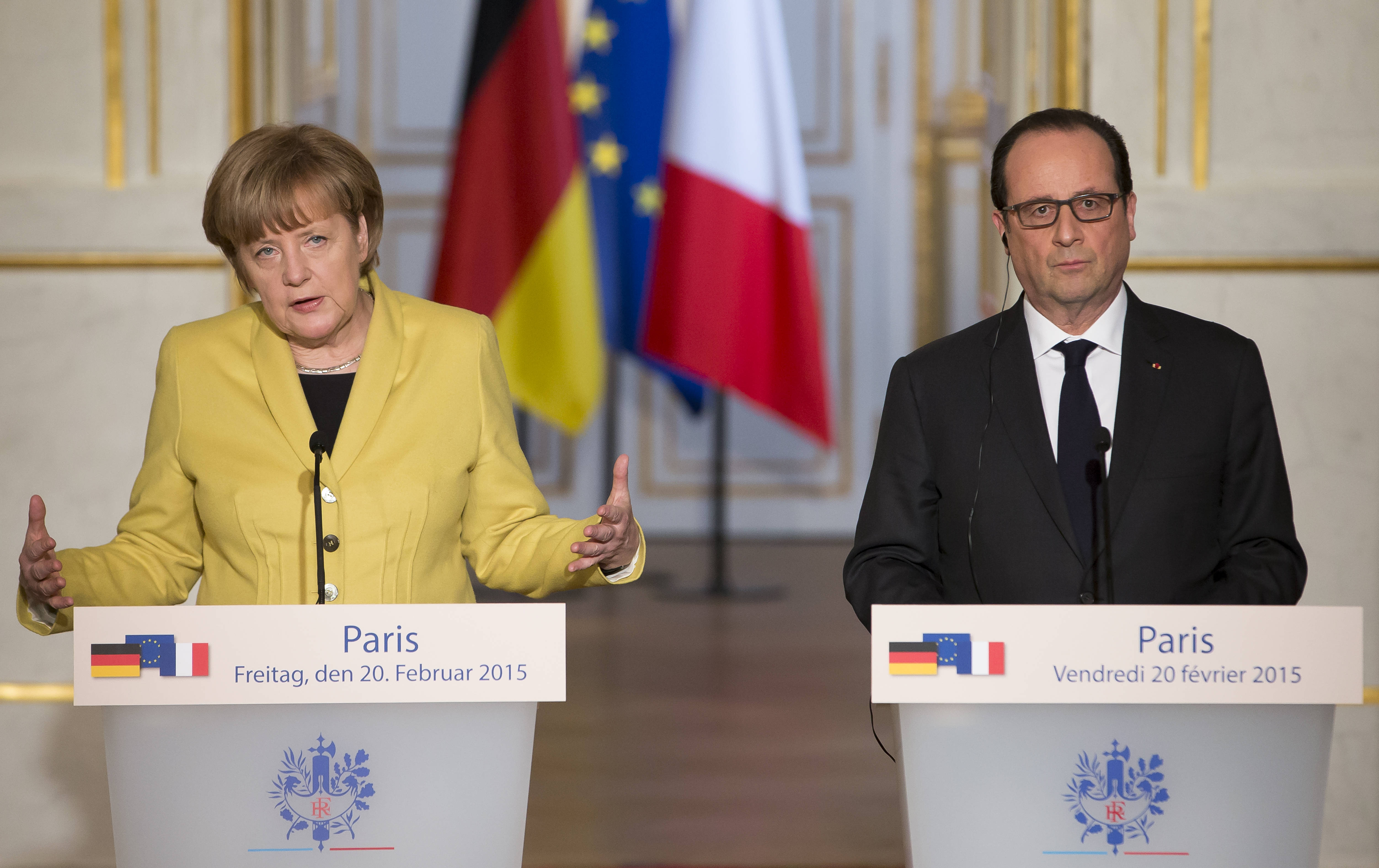 Боевое настроение украинских властей, отразившееся в этих символических жестах, однако, пока не находит соответствующего отклика у европейских держав. В пятницу в Париже прошла встреча канцлера Германии Ангелы Меркель и президента Франции Франсуа Олланда, по большей части посвященная ситуации на Украине и угрозе выполнению минских соглашений, возникшей в результате наступления пророссийских сепаратистов в районе Дебальцева. Оба политика были осторожны: