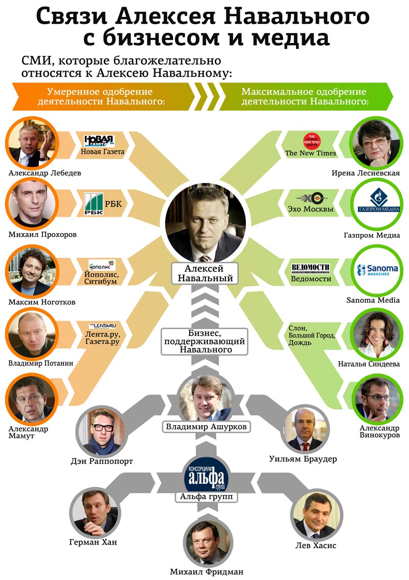 Это инфографика была создана в декабре 2013 года. С тех пор Кремль сменил собственника и редакционную политику Ленты.ру и Газеты.ру, атаковал «Эхо Москвы», отобрал офис у холдинга, объединяющего «Дождь», «Слон» и «Большой город», принял закон о зарубежных акционерах СМИ, из-за которого «Ведомости» могут сменить собственника (и редакционную политику), а на Владимира Ашуркова завел уголовное дело, вынудив его уехать из страны. Да и сам Навальный редко появляется на свободе. Миссию свою Администрация президента в целом может пока считать успешной.