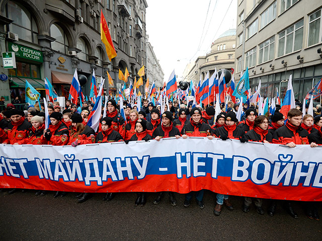 На сайте "Первого канала" сообщается, что собравшиеся выступают "против "цветных революций", против того, что произошло в Киеве конце февраля 2014-го, что запустило целую цепочку трагических событий: госпереворот на Украине, кризис, человеческие жертвы, гуманитарная катастрофа". Приводится два свидетельства участников марша - из Тюмени и Псковской области.