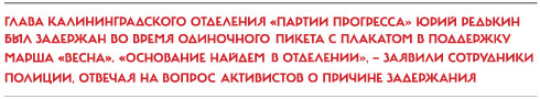 20 февраля, пятница В Калининграде и в Минеральных водах задержаны организаторы марша «Весна». Михаил Назаренко из Минеральных Вод дважды пытался согласовать проведение протестного марша 1 марта с администрацией города, однако так и не получил ответа. После подачи третьего заявления он был задержан на выходе из мэрии. Суд дал Назаренко 5 суток административного ареста «за участие в несанкционированном митинге». Глава калининградского отделения «Партии Прогресса» Юрий Редькин был задержан во время одиночного пикета с плакатом в поддержку марша «Весна». «Основание найдем в отделении», — заявили сотрудники полиции, отвечая на вопрос активистов о причине задержания. Накануне, 19 января, к 15 суткам административного ареста был приговорен лидер партии Алексей Навальный (см. стр. 26).