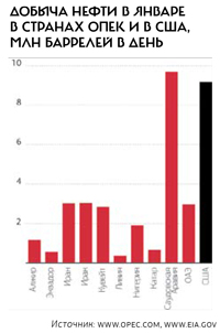 Парадокс: число разрабатываемых скважин сокращается на глазах — только за одну неделю февраля были приостановлены работы почти на 100 скважинах. В то же время объемы добываемой нефти продолжают расти. В марте откачка нефти в США увеличится на 68 тыс. баррелей в день к февральскому суточному объему и достигнет 5 млн 583 тыс., прогнозирует Департамент энергетики. А в целом в течение года прирост добычи составит 7,8 % — преимущественно за счет увеличения объемов в высокорентабельных районах залегания нефти.