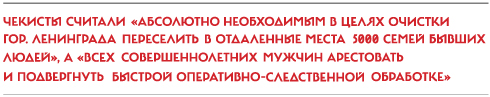 Для проведения спецоперации в Ленинградском УНКВД 25 февраля был создан особый штаб. 27 февраля чекистское ведомство издало циркуляр «О выселении контрреволюционного элемента из Ленинграда и пригородных районов». Исполнителям надлежало использовать малейшие зацепки для предъявления обвинений в контрреволюционной деятельности и отследить, чтобы никто не мог исчезнуть из города и скрыться таким образом от арестов и выселения.