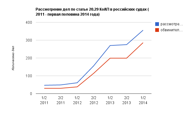 Статья о распространении экстремистских материалов была включена в Кодекс об административных правонарушениях в 2007 году. Она предполагает наказание от одной до трех тысяч рублей или арест до 15 суток. Российские суды ежегодно рассматривают сотни дел по статье 20.29 КоАП, причем статистика Судебного департамента Верховного суда свидетельствует о том, что их количество ежегодно увеличивается. Информационно-аналитический центр «Сова», ведущий мониторинг неправомерного применения «антиэкстремистских» статей, в 2012 году зафиксировал 17, а в 2013 году — 37 неправомерных приговоров по статье 20.29 КоАП.