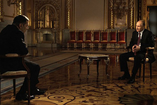 Владимир Путин ответил на вопросы журналиста Владимира Соловьёва. Фото: kremlin.ru «В.СОЛОВЬЁВ: Уважаемый господин Президент, только что вся страна отметила День защитника Отечества, а на территории братской Украины теперь это считается днём захвата Крыма, и Порошенко заявляет, что сделает всё возможное для того, чтобы вернуть Крым.