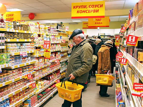 Торговая сеть "Сільпо" в Киеве Комментарий редактора: На хлеб, рис, картофель, мясные и молочные товары ограничения пока не вводились. В то же время, выбор этих товаров во многих магазинах в последнее время существенно оскудел. Кроме того, по данным РИА Новости, украинцы стараются избавиться от стремительно обесценивающейся гривны и активно скупают продукты и бытовую технику в магазинах. Официальный курс доллара, установленный Нацбанком Украины на 24 февраля, составляет 28,29 гривны, евро — 31,96 гривны. Украинский премьер Арсений Яценюк уже потребовал провести внеочередное заседание парламентской коалиции для установления и устранения причин обвала национальной валюты.