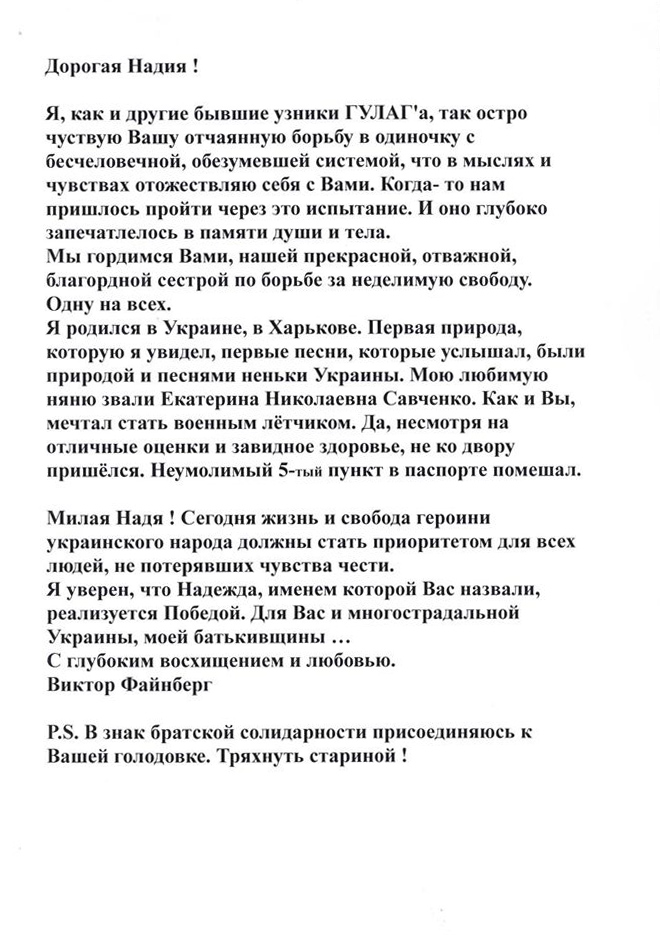 Накануне российские правозащитники передали в администрацию президента России обращение с просьбой изменить Савченко меру пресечения. "Сегодня в 13.30 отнесли в приемную Президента РФ Путина Владимира Владимировича текст обращения об изменении меры пресечения Надежде Савченко", – написала накануне на своей странице в фейсбуке журналист и правозащитник Зоя Светова. Позже от нее стало известно, что к голодовке Савченко присоединился советский диссидент Виктор Файнберг, один из участников акции протеста на Красной площади в 1968 году против ввода советских войск в Чехословакию.