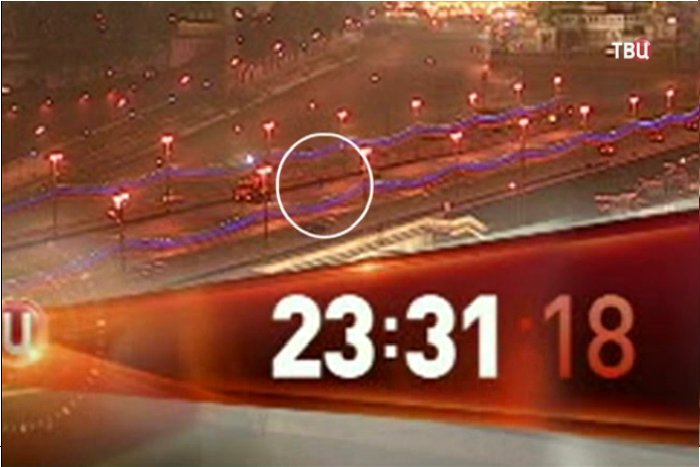 сообщается на сайте канала. Гибель политика зафиксировала всепогодная камера, снимающая Большой Москворецкий мост круглосуточно. Запись показывает, как двое, предположительно, Борис Немцов и его спутница, идут в сторону Болотной площади. Затем их нагоняет снегоуборочная машина, скрывающая их от камеры. Спустя секунду человек выбегает оттуда на проезжую часть, садится в автомобиль и уезжает. Из проезжающих машин появляются двое людей, которые внезапно убегают под мост. Затем, в 23:42, на место преступления приезжает полиция, а из-под моста появляются двое, предположительно, те, что убегали ранее, комментирует журналист телеканала.
