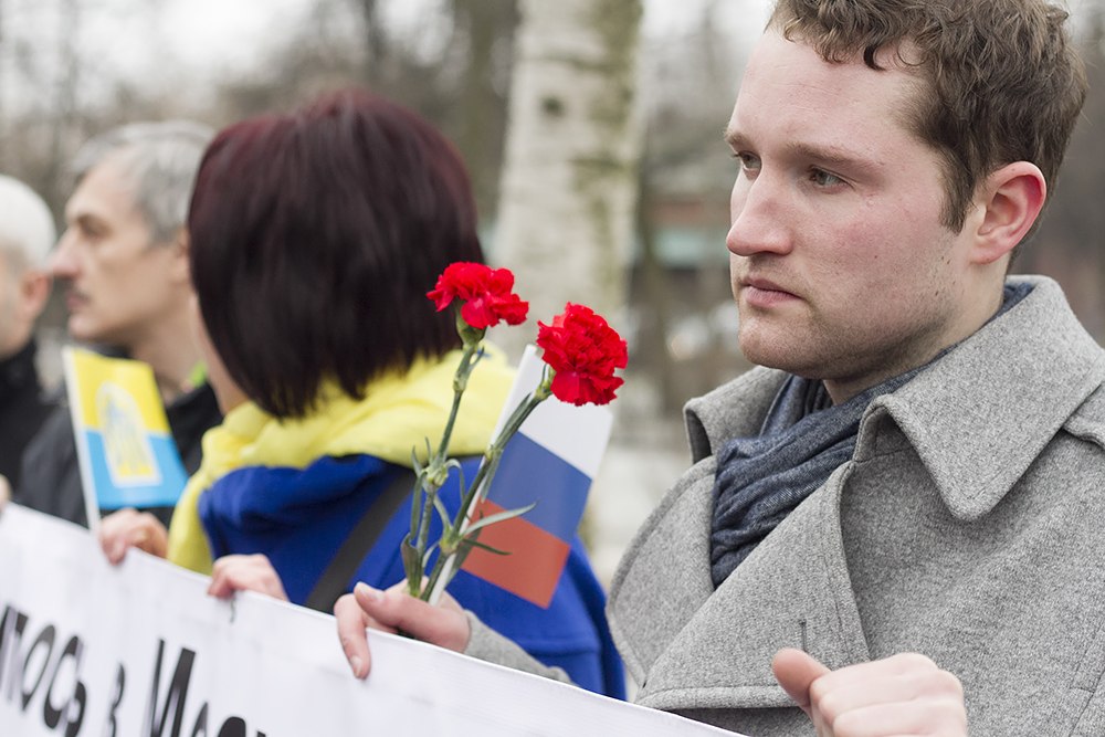 Митинг на Марсовом поле был заранее согласован и давно запланирован. О проведении антикризисного марша «Весна» 1 марта объявил Алексей Навальный. В Петербурге его удалось согласовать не с первой попытки. Однако после убийства Бориса Немцова, которое произошло в ночь с 27 на 28 февраля, мероприятие приобрело траурный характер: все выступления начинались со слов в память о Немцове, а о политическом и экономическом кризисе в России теперь говорили только в контексте убийства оппозиционера. — Для меня Борис Ефимович был не коллегой, не соратником, а учителем и другом, — говорил сопредседатель партии «РПР-Парнас» Андрей Пивоваров с казавшейся слишком маленькой для многолюдной толпы сцены, куда люди клали цветы. — Это тот человек, который должен был быть всегда. Раньше мы знали, что мы можем посидеть дома, потому что выйдет Немцов и скажет за нас; мы можем промолчать, потому что Немцов скажет те мысли, которые вы храните на кухне. Теперь его нет, некому говорить за нас. Некому организовывать марши и говорить на них. Теперь мы должны это делать — вы должны.Раньше мы знали, что мы можем посидеть дома, потому что выйдет Немцов и скажет за насПока участники шествия подтягивались к месту митинга, полицейские сгоняли фоторепортеров и зевак с монументов на Марсовом поле. «Это могила, а не место для фотографий», — говорили они. Митингующие плотно толпились перед сценой, тщетно стараясь избегать гигантских луж, хлюпающей грязи и растаявшего льда, которые ранней весной занимают большую часть Марсова поля. По обледеневшему газону проходили люди, закутанные в флаги России и Украины. Несколько человек держали флаги Евросоюза. Как объяснил один из них, флаги символизировали то, что Россия «ушла с европейского пути развития и должна на него вернуться». — Мы против насилия и террора, мы за свободную страну, мы хотим, чтобы наши дети жили в европейской свободной стране, — объяснила участница митинга, придерживавшая позади сцены громадную фотографию Немцова. — Убийство Немцова — это продолжение того, что уже было: «подарок» с убийством Политковской, с убийством Влада Листьева. Это очередной «подарок».