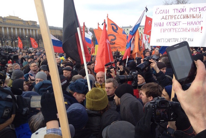 Фото: Егор Цветков / «Бумага» На митинге выступило всего около 20 человек: депутаты Законодательного собрания Максим Резник, Борис Вишневский, Александр Кобринский, Ольга Галкина, председатель петербургского «Яблока» Андрей Палевич, представители движений «Весна», «Открытая Россия», анархисты, ЛГБТ-активисты, журналисты. Время от времени со сцены пробовали скандировать «Позор», «Не забудем, не простим», но толпа крайне неохотно подхватывала лозунги. Гораздо чаще петербуржцы аплодировали. Мы хотим, чтобы наши дети жили в европейской свободной странеВ то время как ораторы возмущались «дворцами Путина» и зарплатой Сечина, в центре толпы послышался невнятный шум: людские ряды рассекали сотрудники полиции. Выступавший в это время активист «Весны» на время прекратил монолог. — Не забирайте, пожалуйста, людей! Давайте будем вести себя адекватно, молча и тихо. Полиция, остановите провокаторов! — срывающимся голосом он призывал то ли отпустить, то ли, наоборот, немедленно задержать тех, за кем пришли полицейские. Оказалось, что сотрудники полиции, достигнув центра толпы, потребовали от анархистов убрать черно-красные флаги и пригрозили, что задержат их, если те откажутся. Но анархисты вступили с полицейскими в спор, отказались опустить знамена и только продвинулись с ними чуть ближе к сцене. — Они думают, что это флаги «Правого сектора», — объяснила девушка, собирая металлическую конструкцию для флага. Казус случился из-за совпадения цветов символики анархо-коммунистов и расцветки флагов украинской националистической организации, признанной в России экстремистской. Депутат Закса Борис Вишневский со сцены сказал, что на митинге разрешена любая не запрещенная законами Российской Федерации символика и, значит, нет причин никого задерживать, но сотрудников МВД это не остановило. Сходив за подмогой, около шести полицейских вновь стали продираться через толпу в сторону красно-черных знамен. В это время стоявшие рядом с анархистами люди начали громко скандировать «Соблюдайте ваш закон» и «Полиция — провокаторы».