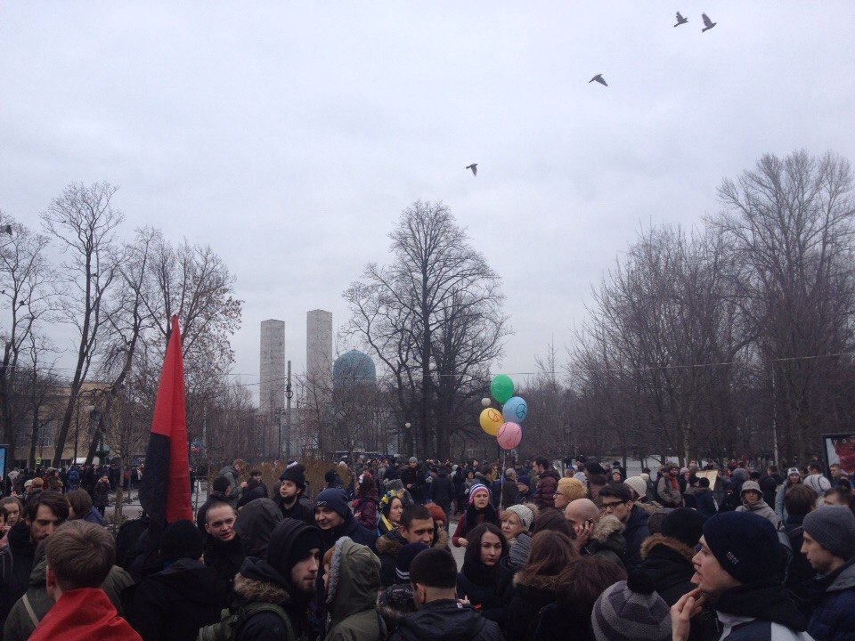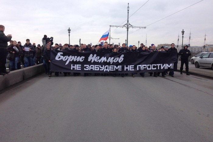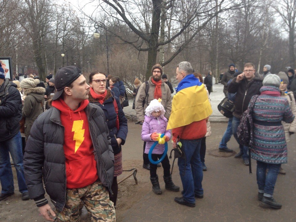 По оценкам корреспондентов «Бумаги», у станции метро «Горьковская» собралось от 1,5 до двух тысяч человек, участники продолжают прибывать, часть уже двинулась по Троицкому мосту в сторону Марсова поля. Многие приходят с портретами Немцова, цветами, табличками «Je suis Boris» и «Я — Борис». Кроме того, участники действительно используют украинскую символику — желто-синие флаги, венки. Всего, по оценкам очевидцев, в петербургском марше принимает участие от пяти до десяти тысяч человек. КОНТЕКСТ На антивоенный марш, посвященный памяти Бориса Немцова, собралось около десяти тысяч участников