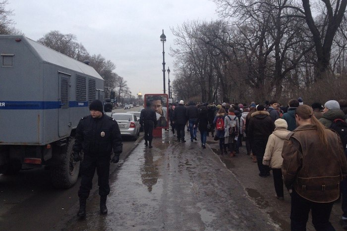 На антивоенном марше в Петербурге полиция задержала одного из организаторов Всеволода Нелаева за нарушение условий проведения мероприятия. Многие из участников акции пришли на марш с украинскими флагами, что не было согласовано заранее. Нелаев взял ответственность за нарушение на себя и был задержан. Изначально акция задумывалась как антивоенный и антикризисный марш. Согласование на проведение власти города не дали, однако накануне удалось найти компромисс. Как до этого сообщил депутат Борис Вишневский, «Антивоенный марш» в Петербурге посвятили памяти убитого в Москве оппозиционного политика Бориса Немцова. По условиям, акция должна была пройти без политической символики. Полиция в свою очередь гарантировала, что не будет мешать шествию и выставлять ограничительные заграждения на Марсовом поле.