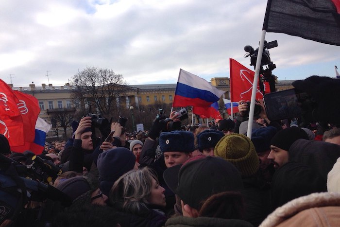 признана в России экстремистской. Полиция несколько раз предпринимала попытки задержаний, три флага анархистов передали ближе к сцене. Однако никто из участников митинга задержан не был, организаторам удалось разрешить конфликт с сотрудниками полиции. Со сцены депутат Борис Вишневский призвал полицейских не задерживать участников митинга, которые используют не запрещенную законами Российской Федерацию символику. До этого, во время шествия на Троицком мосту,