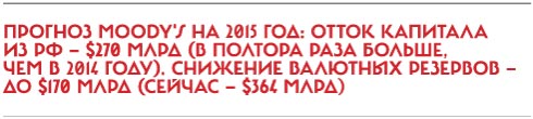 Первая причина, по которой Moody's не верит в способности властей РФ, — сложность самой проблемы. «Структуры в РФ, принимающие решения в области экономической политики, столкнулись с многоуровневой дилеммой: им одновременно необходимо реагировать на обвал валютного курса, масштабный отток капитала, снижение экономической активности и рост инфляции. С точки зрения Moody's, маловероятно, чтобы эти структуры были способны согласовать противоречия, возникающие при решении таких задач, обеспечив разворот от спада в экономике», — говорится в заявлении агентства. Moody's не верит во временность проблем. Зато уверено в том, что обстоятельства в ближайшие месяцы не позволят правительству РФ спокойно с ними разбираться. Именно поэтому, полагает Moody's, нет оснований считать, что отток капитала из России будет меньше, чем с середины 2014 года. Именно поэтому на 2015 год агентство, прогнозирующее уже довольно сильную, но не обвальную (6% ВВП) рецессию по итогам 2014-го, ожидает крайне высокого оттока капитала из РФ — $270 млрд — в полтора раза больше, чем в 2014 году.