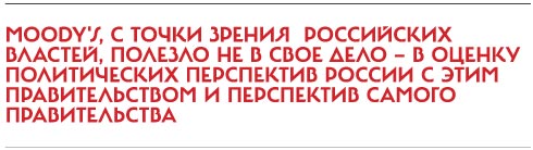 Cтоль же аккуратно вело себя с Москвой и Moody's. В январе, когда встал вопрос о пересмотре рейтинга РФ, агентство выдало довольно комплименарный по отношению к российской экономической ситуации комментарий. Да и 17 февраля, когда кредитный комитет Moody's начал обсуждение о пересмотре, не было и намека на то, что это решение вызовет резкую реакцию в Москве. Но...