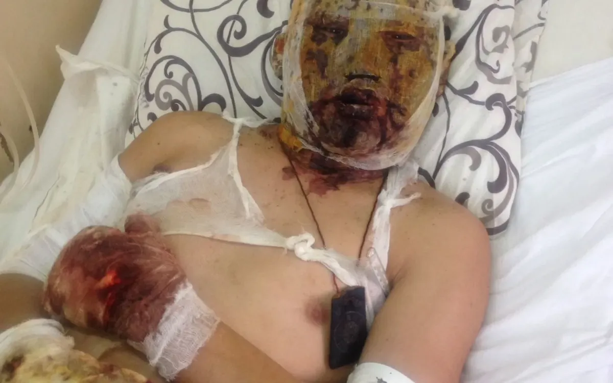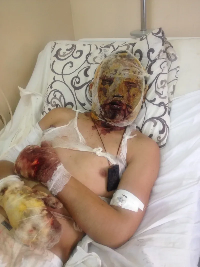 Лицо сожжено, обмотано бинтом, из-под бинта выступает кровь. Кисти рук тоже замотаны. Уши обгорели и съежились.