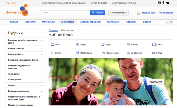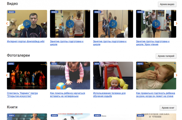 В разделе Медиа можно найти множество видео, фото и книг, а также статьи и презентации по теме синдрома Дауна.