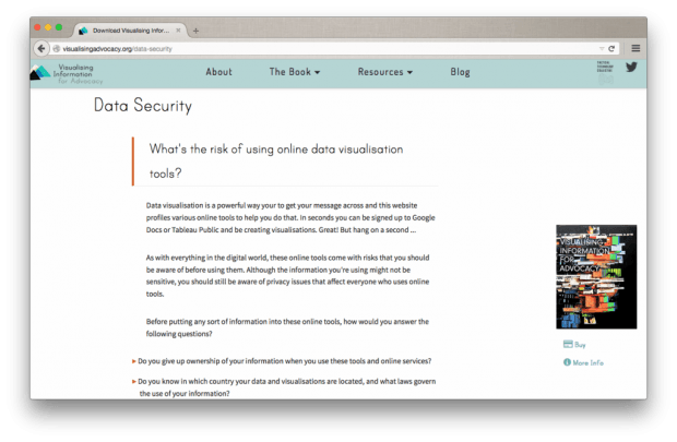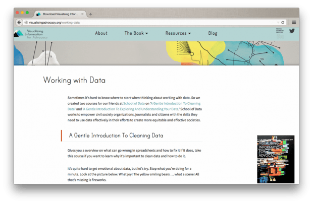На сайте Visualising Information for Advocacy помимо книги о том, как правозащитники и активисты используют визуальные элементы в своих кампаниях, есть раздел ресурсов с инструментами для визуализации информации, работы с данными, полезными сайтами, а также информацией о безопасности данных.