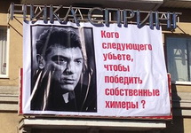 На растяжке площадью примерно 2,5×4 метра помещены портрет погибшего политика и вопрос "Кого следующего убьете, чтобы победить собственные химеры?".