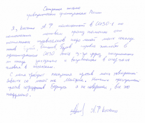 Костенко просит помощи «от постоянных издевательств <…> сокамерников» и пишет, что боится подавать жалобы в администрацию СИЗО «из-за угроз, поступающих от иногда заходящего и вызывающего в оперчасть человека в штатском». По словам Костенко, с него требуют показания против его товарищей, бывших с ним на Майдане. «Никаких преступлений против сотрудников Беркута я не совершал, все это надумано», — утверждает он.