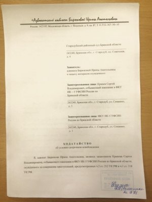 Но адвокат прежде всего обращает внимание на то, что перевод Кривова в другую колонию станет препятствием для рассмотрения заявления о его условно-досрочном освобождении. Бирюкова подала ходатайство об УДО 18 февраля, и, по ее словам, оснований для отказа, если судить по личному делу Кривова, быть не должно. Рассмотрение ходатайства в Стародубском районном суде было назначено на 5 марта. Теперь, поскольку Кривов больше не находится в ИК-5, он сам не сможет присутствовать на заседании, а суд не сможет получить из колонии его личное дело. В этом случае суд должен будет отказаться рассматривать ходатайство. Бирюкова рассказала, что дозвонилась до помощника судьи, который до ее звонка ничего о переводе Кривова в другую колонию не знал. Ходатайство об УДО должен был рассматривать тот же судья, который 18 февраля отказал в удовлетворении жалобы Кривова на нерассмотрение начальством ИК-5 его жалоб. Бирюкова намерена подавать новое ходатайство об условно-досрочном освобождении Кривова — уже в другом суде, по месту его нынешнего пребывания.