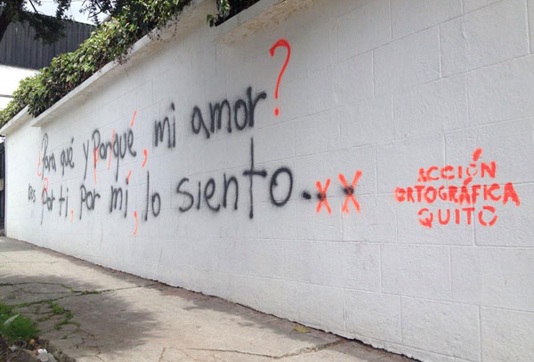 В эквадорской столице Кито развернулась настоящая кампания по борьбе за грамотность на стенах домов. Как сообщает Smithsonianmag.com, группа людей, которая сохраняют анонимность, занимается исправлением орфографических и пунктуационных ошибок в настенных граффити. Члены группы действуют под названием Acción Ortografica Quito. Из интервью, которое эквадорских защитников орфографии дали изданию, стало известно, что их трое. Как правило, они фотографируют граффити на городских стенах, потом на очных встречах где-нибудь за пивом обсуждают их и ищут ошибки, а затем едут на место, где был сделан снимок, и вносят исправления.