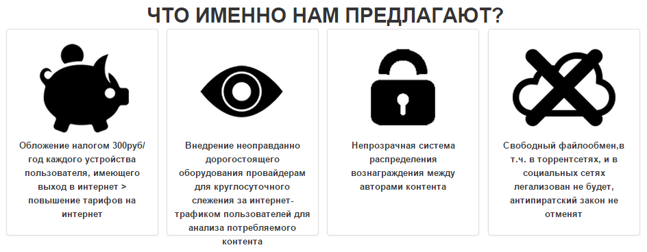 Российский союз правообладателей и г-н Никита Михалков через законопроект, разработанный Минкультуры, предлагают обложить налогом каждого пользователя в сети Интернет за использование и распространение в сети любых произведений, защищенных авторским правом.
