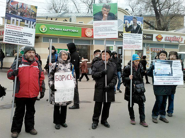 Сторонники Немцова вышли к метро "Баррикадная" с флагами России, Украины и фотографиями политика, с табличками с его цитатами. И в то же время напротив американского посольства, через дорогу, шел пикет Национально-освободительного движения. Активисты пикетировали посольство, которое, по их мнению, причастно к убийству Немцова.