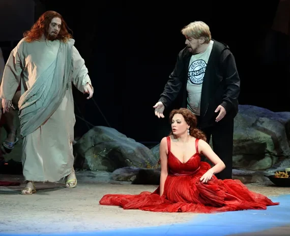 Конфликт — тот же, что у Вагнера: главный герой взрывает атмосферу благонамеренной гламурной тусовки, разворачивая афишу, где Иисус Христос распят между женских бедер. Именно эта деталь спектакля, увиденная в Facebook, а также сам сюжет возмутили митрополита Тихона и Координационный совет. Возмущены были и коллеги Тангейзера — до такой степени, что толпой принялись его избивать.