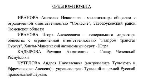 Вместе с Рамзаном Кадыровым орден Почета получили еще трое человек. Это механизатор из Тюмени, генеральный директор «Газпром трансгаз Сургут» и митрополит Тульский и Ефремовский Алексий. Среди известных кавалеров ордена фигурирует олимпийский чемпион Евгений Плющенко.