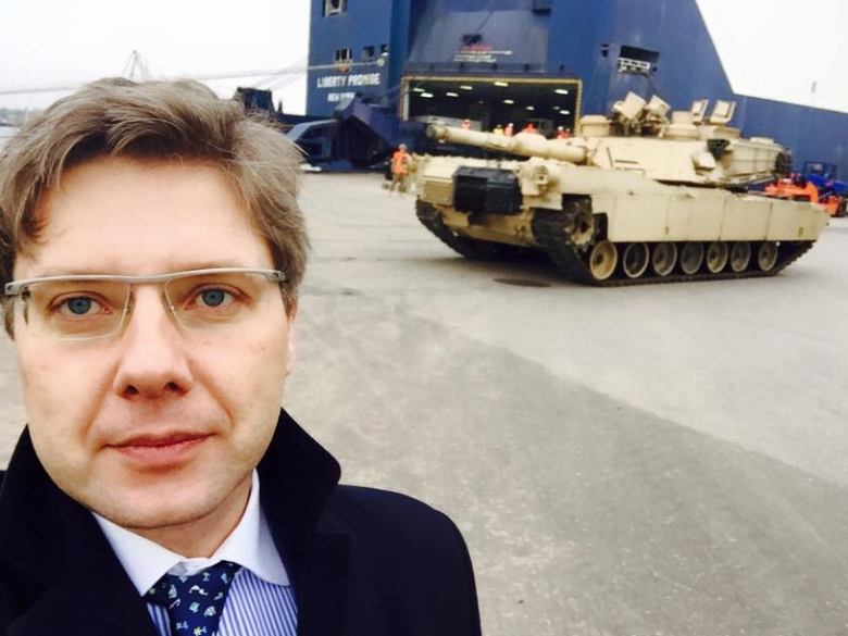 Мэр Риги Нил Ушаков сделал селфи на фоне американского танка М1 «Абрамс» в рижском морском порту. Фото Ушаков опубликовал в своем фейсбуке.