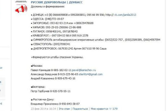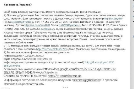 Вот еще одно объявление от 25 февраля 2014 года, распространенное в интернете (группа, в которой оно было опубликовано изначально, уже удалена, но остались републикации: "Мы отправляем людей в Донецк и Харьков как самые важные центры сопротивления. Также можно отправиться в Одессу. Если ты намерен поехать в Донецк - пиши этому человеку: Владимир http://vk.com/vlmir Почта: prokopenko@yandex.ru Тел: +7-950-843-38-07. Если намерен двигаться в Харьков - пиши этому человеку: Руслан http://vk.com/lrus1981 Почта: rus8319@yandex.ru Тел.: +7-904-096-40-20. Если в Одессу - этому: Егор - +380 63 173 6352, kom@inbox.ru. Выезд в Донецк происходит из Ростова-на-Дону, выезд в Харьков – из Белгорода".