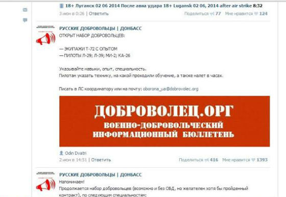 У Оксаны Реневой закреплена запись 2015 года: "Требуются: танкисты, артиллеристы, бмп, бтр, стрелки, проф разведка, разведка, саперы, снайперы". А 2 июня группа набирала пилотов Л-29, Л-39, МИ-2, КА-26, потом правда удалили объявление.