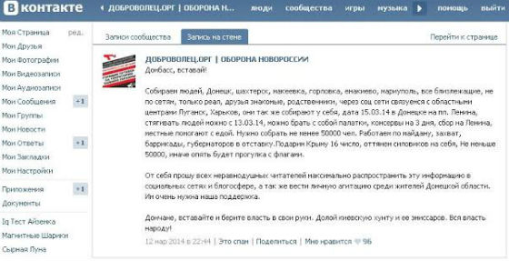 Запись от 12 марта: "Собираем людей, Донецк, шахтерск, макеевка, горловка, енакиево, мариуполь, все близлежащие, не по сетям, только реал, друзья знакомые, родственники, через соц сети связуемся с областными центрами Луганск, Харьков, они так же собирают у себя, дата 15.03.14 в Донецке на пл. Ленина, стягивать людей можно с 13.03.14, можно брать с собой палатки, консервы на 3 дня, сбор на Ленина, местные помогают с едой. Нужно собрать не менее 50000 чел. Работаем по майдану, захват, баррикады, губернаторов в отставку.Подарим Крыму 16 число, оттянем силовиков на себя, Не меньше 50000, иначе опять будет прогулка с флагами". 15 марта действительно состоялся штурм СБУ в Донецке - правда, меньшими силами.