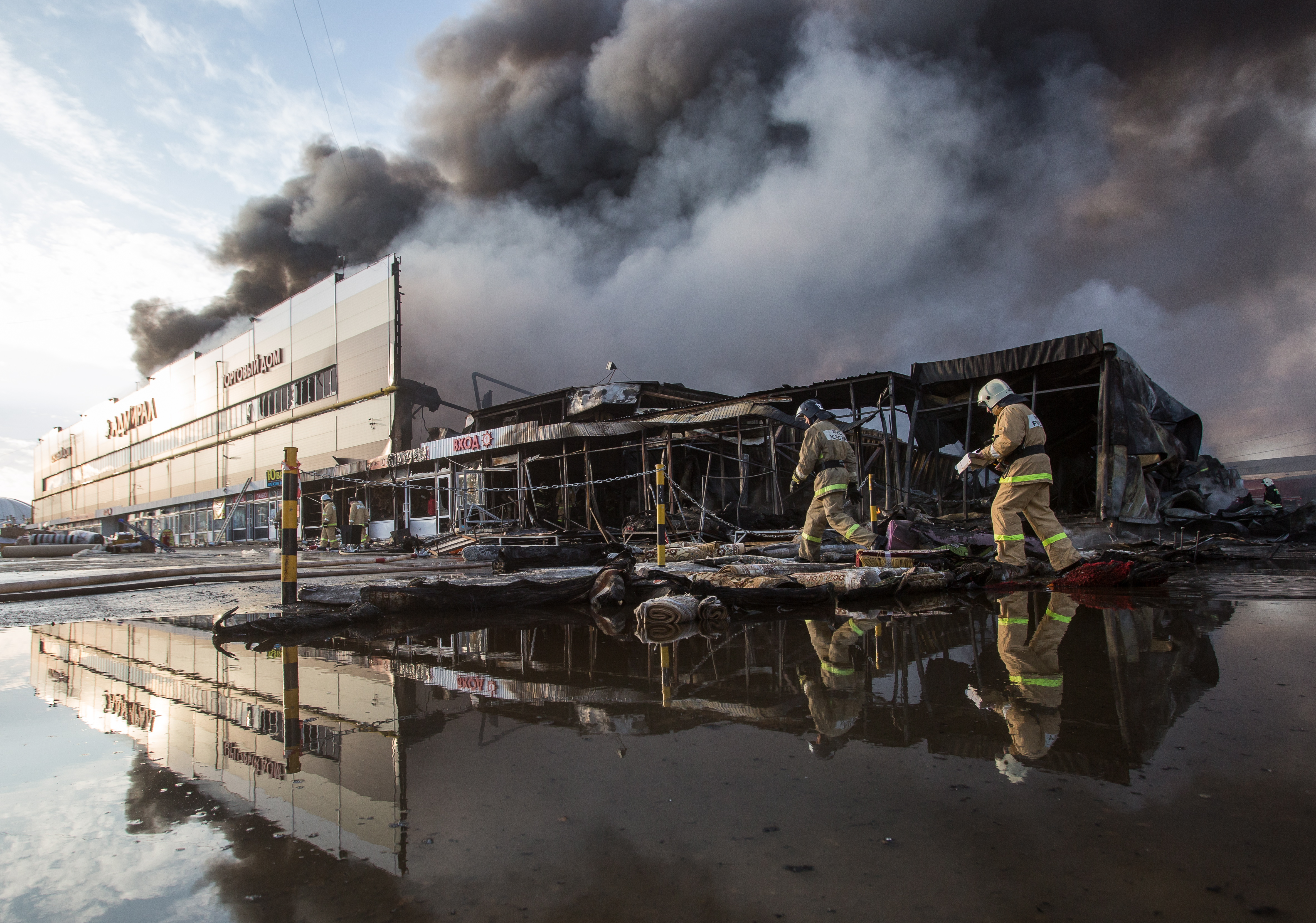 Пожар в трехэтажном торговом комплексе "Адмирал" произошел днем 11 марта и был потушен только поздно вечером. Из торгового центра были спасены около 650 человек, но некоторые из предпринимателей после эвакуации бросились обратно в горящее здание, чтобы спасти свой товар.