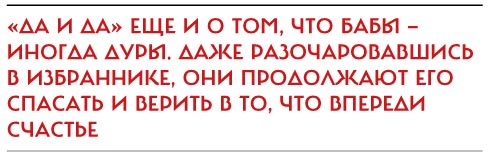 «Да и да» еще и о том, что бабы — иногда дуры. Даже разочаровавшись в избраннике, они продолжают его спасать и верить в то, что впереди счастье. Героине все-таки хватает сил, чтобы оценить ситуацию и метафорически сжечь прошлое. Вопрос в том, сжигает ли она при этом свое настоящее и будущее. Сумеет ли она стать самостоятельной величиной? Фильм Гай Германики, кажущийся, на первый взгляд, отчаянно феминистским, при ближайшем рассмотрении оказывается картиной, задающей отчаянные вопросы. Фото: EAST NEWS, youtube.com