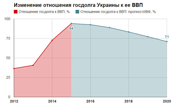 Государственный долг Украины, учитывая правительственные гарантии долгов госпредприятий, к концу года, по мнению МВФ, может достигнуть 94% ВВП, тогда как еще в конце 2014 года составлял «всего лишь» 73% ВВП. Таким образом Украина станет одной из самых закредитованных развивающихся стран в мире.