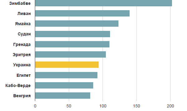 Иными словами, не исключен сценарий, при котором долг станет фактически невозвратным: сейчас только у Японии госдолг вдвое превышает размер ВВП, но экономика этой страны хоть и сталкивается с постоянными проблемами, может служить только примером для Украины. Даже у Греции, которую недавно спасали от банкротства совместными усилиями Еврокомиссия, Европейский центральный банк и МВФ, уровень госдолга находится в районе 160% ВВП. Самый большой долг среди развивающихся стран, по данным МВФ, принадлежит Ямайке — почти 150% ВВП.