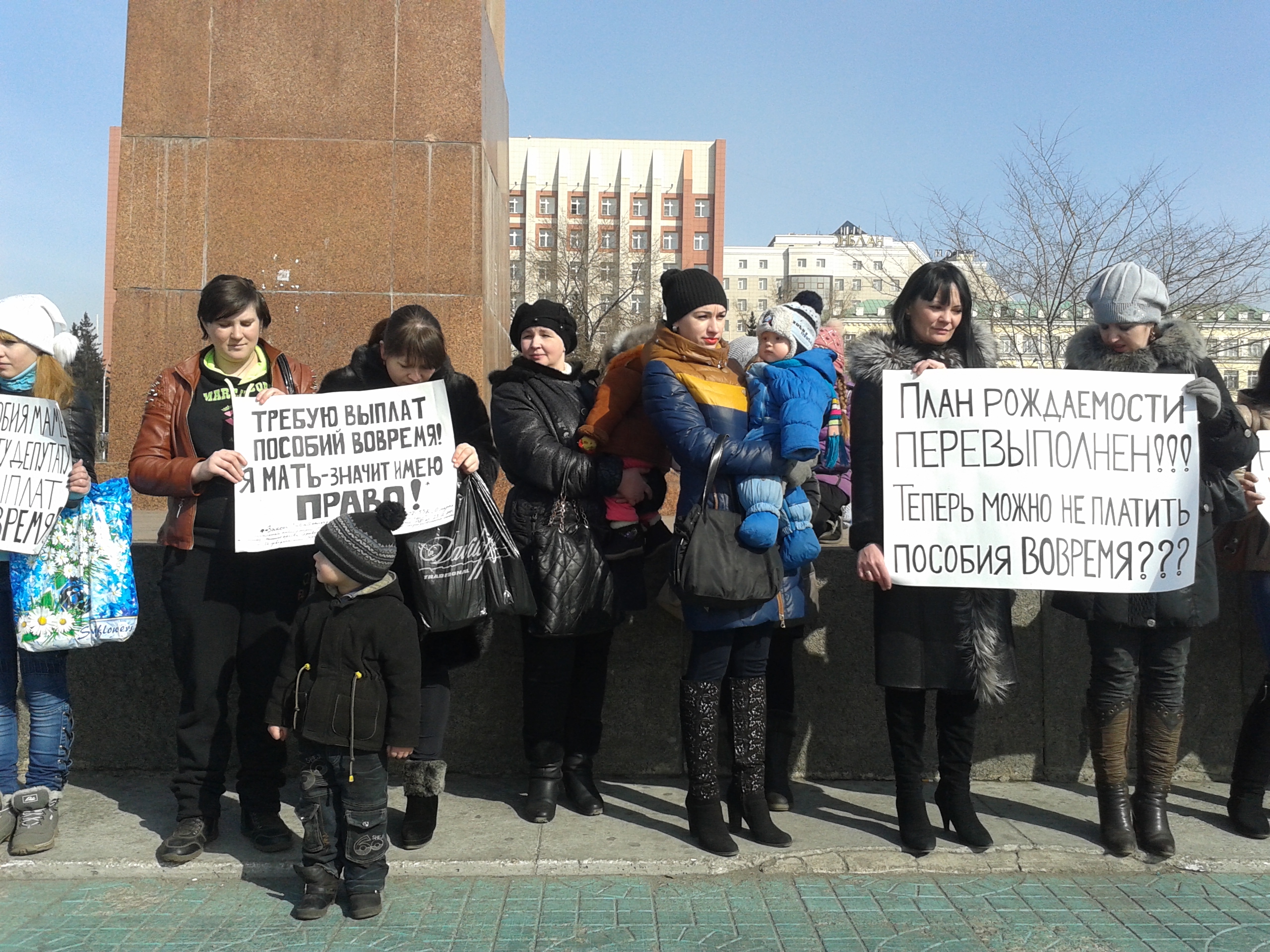 В Чите многодетные матери вышли в субботу на пикет за своевременную выплату детских пособий. Их акцию поддержали представители из регионального отделения КПРФ. На руках женщин были лозунги – "Дети Забайкалья – это дети России!!!", "Отсутствие финансовой возможности не является причиной для нарушения прав многодетных матерей", "Дыры в бюджете детьми не затыкают!", "Нет экономии на матерях и детях!"