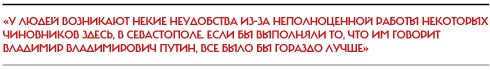 Еще один собеседник журнала — владелец торговых сетей Сергей Лисейцев, продвигавший «русскую идею» в Крыму со времен украинской «оранжевой революции». Он считает, что все недостатки — временные, и вина за них лежит на местной власти: «У людей возникают некие неудобства из-за неполноценной работы некоторых чиновников здесь, в Севастополе. Если бы выполняли то, что им говорит Владимир Владимирович Путин, все было бы гораздо лучше».