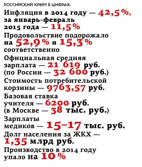 Первую зиму после, как здесь говорят, «возвращения в родную гавань», Крым прожил трудно, но не настолько, чтобы пророссийское большинство разочаровалось в своем выборе. Возникали проблемы с водой, электричеством и продуктами. Люди потратили много часов и нервов на стояние в многотысячных очередях, чтобы поменять украинские документы на российские. Из-за западных санкций с полуострова ушли платежные системы Visa и Master Card, стало невозможно пользоваться платными интернет-услугами и напрямую переводить деньги за границу. Перестали приезжать украинские и иностранные туристы.