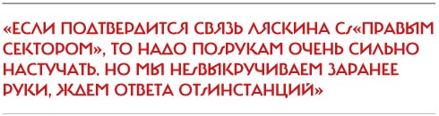 «Если они просят наиболее ярких националистов, чтобы их прислали на территорию нашей страны, то почему бы и не быть «Правому сектору»*? Мы должны дождаться проверки соответствующих структур по данному факту. Если подтвердится связь с «Правым сектором»*, то надо по рукам очень сильно настучать. Но мы не выкручиваем заранее руки, ждем ответа от инстанций», — говорит депутат. Сам Ляскин теперь ждет, что к нему в любой момент могут явиться с обыском — проверить подлинность переписки можно, только изъяв компьютеры, телефоны и другие средства связи.