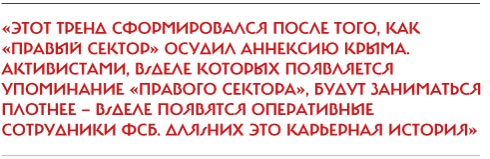 При этом «Правый сектор»* давно фигурирует в делах, возбуждаемых в России, рассказал NT адвокат Дмитрий Динзе. Следы украинских националистов российские следователи нашли в деятельности калининградского «Комитета общественной самозащиты» и в деле украинского режиссера Олега Сенцова, которого обвиняют в подготовке терактов в Крыму. «Этот тренд сформировался после того, как «Правый сектор»* осудил аннексию Крыма. Активистами, в деле которых появляется упоминание «Правого сектора»*, будут заниматься плотнее — в деле появятся оперативные сотрудники ФСБ. Для них это карьерная история», — говорит адвокат.