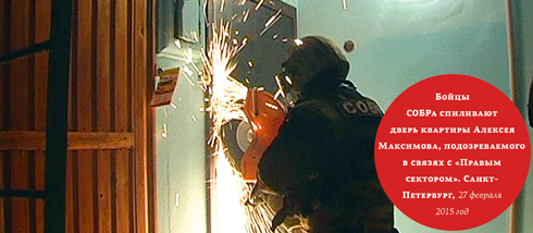 Алексей «Муха» Максимов на акции протеста в Украине «С прицелом на общественный резонанс» «Алексей Александрович! Мы пришли к вам с обыском. Если вы добровольно дверь не открываете — мы вам сейчас ее спиливаем!» — кричал утром 27 февраля под дверью питерской квартиры известного неонациста Алексея Максимова худощавый мужчина в очках и с бородкой. Это был следователь Главного следственного управления Следственного комитета (СК) по Петербургу, своего имени он не назвал. В среде ультраправых Максимова, имевшего судимости за хулиганство и умышленное причинение тяжкого вреда здоровью, знали под прозвищем «Муха». Сопровождавшие следователя бойцы СОБРа спилили «болгаркой» замок, влетели в квартиру и сбили с ног густо покрытого нацистскими татуировками Муху, стоявшего в прихожей в одних трусах. Кадры оперативной съемки обыска у Максимова позднее показали по телевидению. На экране мелькали украинские националистические стикеры, нацистские знамена, флажок «Правого сектора»* и флаг Украины. Перечисляли последние подробности биографии Мухи — поддерживает украинский «Правый сектор», дрался на Майдане с «Беркутом».