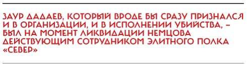 ## Версии На момент подписания номера в печать следствие представило две главные версии. Одна: убийство Бориса Немцова — это личная месть радикальных мусульман за некие антиисламские высказывания Немцова после расстрела редакции парижского Charlie Hebdo, публиковавшего карикатуры на пророка. Вторая версия была растиражирована спустя неделю после первой, 13 марта: неназванный источник в следственной группе сообщил агентству «Интерфакс», что в качестве приоритетной теперь рассматривается версия о том, что целью убийства оппозиционного политика была «дискредитация власти», а «следы заказчиков ведут за рубеж». Правда, эту версию уже на следующий день после убийства Немцова (и накануне марша протеста) озвучивал представитель Следственного комитета России Владимир Маркин. Именно он тогда назвал Немцова «сакральной жертвой» для тех, «кто не гнушается никакими методами для достижения своих политических целей». Но потом что-то пошло не так, СКР и Маркин пропали с экранов, а на первый план вышли ФСБ и мстители за ислам. Однако и тут случилась незадача: спустя два дня после ареста находящийся в СИЗО «Лефортово» Заур Дадаев, до этого якобы взявший всю вину на себя, рассказал членам Общественно-наблюдательной комиссии о своей невиновности и о том, что его пытали после задержания, разваливая таким образом столь удобную для следствия версию, которая не предполагает заказчика убийства. Дескать, несколько фундаменталистов четыре дня (по другим данным — еще с сентября) выслеживали Немцова, определяя его маршруты и привычки, а потом, движимые оскорбленным религиозным чувством, его и застрелили, проявив при этом еще и кавказское благородство — даму, спутницу политика в тот вечер Анну Дурицкую, не тронули. То есть заказчика никакого не было — как в истории с Charlie Hebdo, а, значит, и искать его не требуется. Наблюдатели эту затею оценили: власть решила обрезать ниточки, ведущие к реальным убийцам Бориса Немцова — к тем, кто сами кровью не пачкаются, а лишь отдают приказы другим — способным точно попасть в сердце. Судя по всему, теперь кукловоды хотят и вовсе увести следствие за пределы Родины — подальше от тех, кто составляет расстрельные списки и передает их на исполнение.