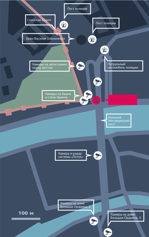 В эти камеры должны были попасть и Борис Немцов со спутницей, и заезжающий на мост автомобиль преступников. Расположение камер — 50 метров от места убийства.