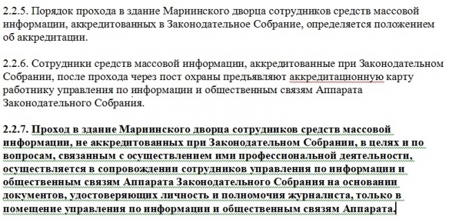 Выписка из Положения о режиме работы в здании Мариинского дворца, утвержденного распоряжением Председателя Законодательного Собрания от 12 марта 2015 года 106-р