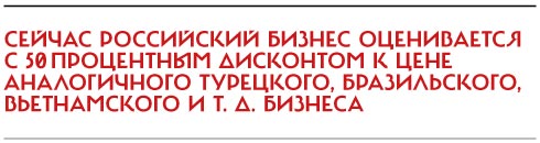 Спасибо, не надо Казалось бы, время для продаж не самое плохое. Российские активы весьма дешевы. Отношение капитализации к годовой прибыли (P/E) для компаний, входящих в индекс MSCI Russia, составляет сейчас 6,95. А для развивающихся рынков в среднем (входящих в индекс MSCI Emerging Markets) — 13,88, ровно вдвое больше. В конце января этот разрыв был совсем велик: 3,4 против 12,1. Сейчас российский бизнес оценивается с 50 -процентным дисконтом к цене аналогичного турецкого, бразильского, вьетнамского и т. д. бизнеса. Еще больше у российских компаний и развивающихся рынков в целом разрыв между отношением капитализации к ожидаемой (будущей) прибыли. Он достигает 2,76 (4,13 у MSCI Russia против 11,4).