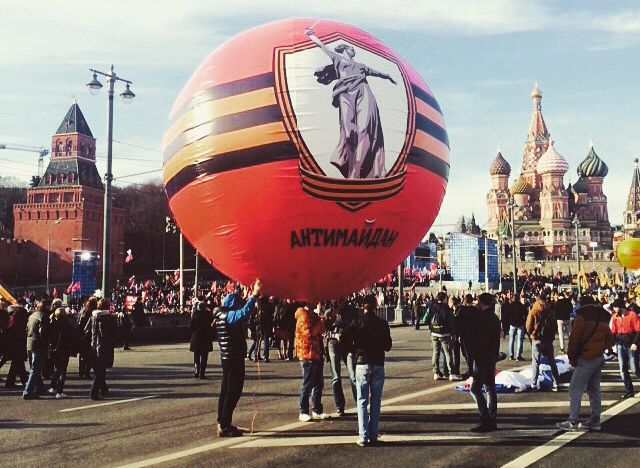 Около места убийства Немцова в небе парил монструозных размеров шар с эмблемой движения «Антимайдан» — того, которое называло Немцова представителем «пятой колонны» и «организатором Майдана».