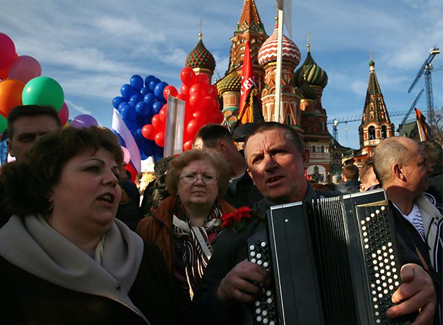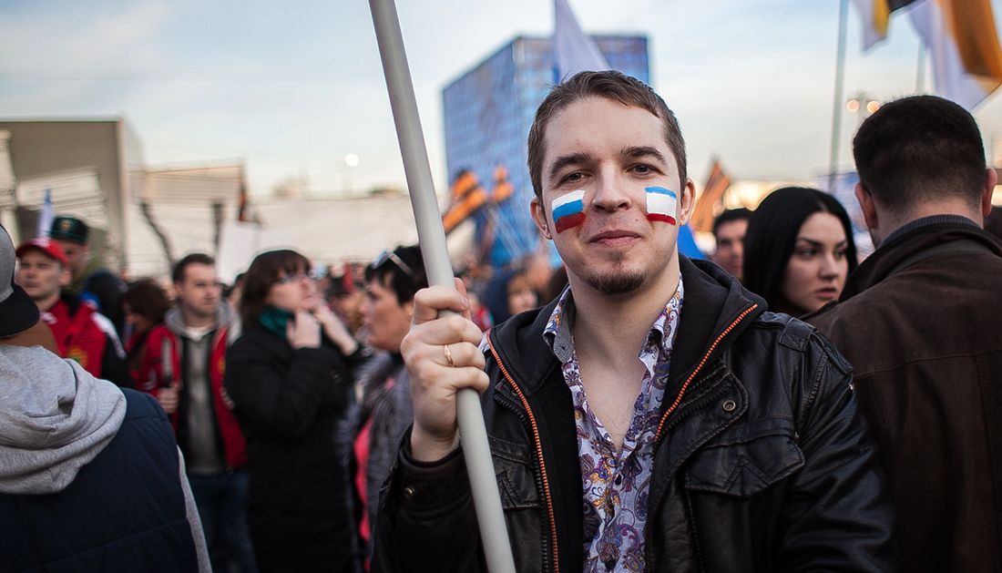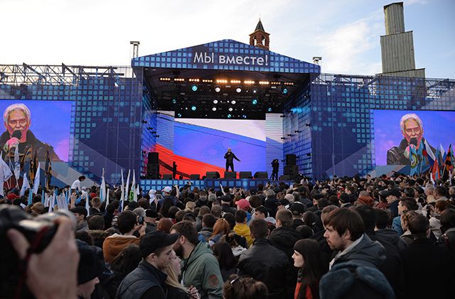В Москве в первую годовщину присоединения Крыма и Севастополя к Российской Федерации прошел митинг-концерт на Васильевском спуске. По данным полиции, в разгар рабочего дня к Кремлю пришли 110 тысяч человек. Практически каждый выступавший со сцены подчеркивал значимость нового праздника для России и отмечал заслуги президента Владимира Путина в том, что в Крыму не случилось войны, как в Донбассе. Для собравшихся спели любимые артисты Путина и российского народа — Григорий Лепс и группа «Любэ», а сам президент произнес небольшую духоподъемную речь. Специальный корреспондент «Медузы» Илья Азар послушал пафосные речи политиков и пообщался со счастливыми посетителями митинга.