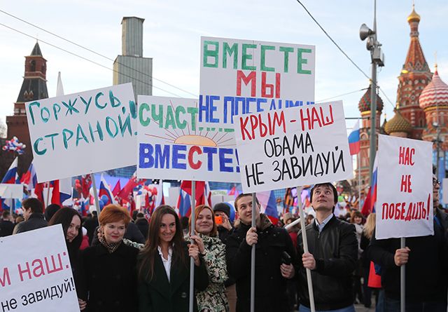 Публика несколько отличалась от похожего шествия движения «Антимайдан», состоявшегося в Москве в годовщину победы «Евромайдана» 21 февраля 2015-го — было больше радостных и улыбающихся лиц. Плакаты, которые несли люди 18 марта, оказались в основном позитивными: «Крым и Севастополь — колыбель русского духа», «Крым — это святое», «Счастливы вместе» и так далее.